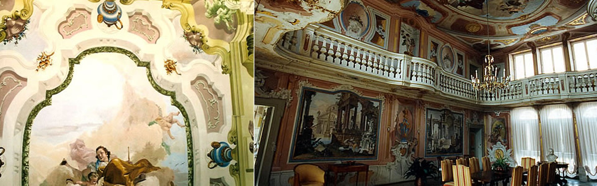 Over the ballroom backgrounds decorated in a late baroque style are inserted four symmetrical views, representing architectural prospectives and landscapes with ruins dotted by cultural hints of classic archeology (e.g. engraving on the frescoes letters of the "linear A" scripture, by the time not yet decoded). In the middle of the panels painted on the ball room walls, symmetrically on the right and left side of two central vases, appear frescoes representing the main themes characterizing the family: the law, the painting, the music, and the feudal power.
